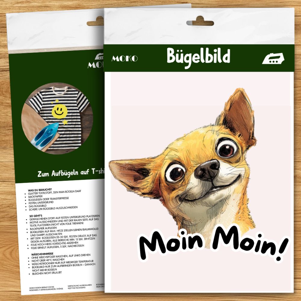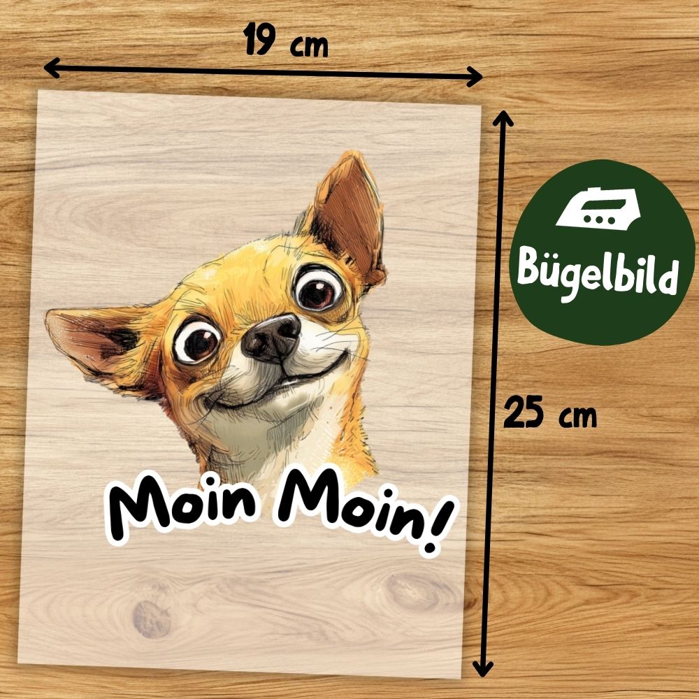 Chihuahua Bügelbild „Moin Moin“, Süßer Chihuahua Hundekopf mit schiefem Blick in Aquarelloptik, Norddeutsches Hundemotiv für Kinder T-Shirt, Hoodie und Stoffe