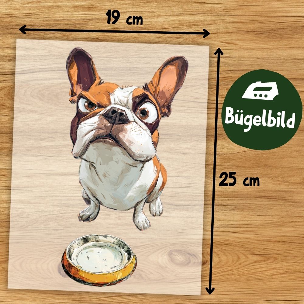 Französische Bulldogge Bügelbild, Erwartungsvolle Bulldogge vor Futternapf in Aquarelloptik, Lustiges Cartoon-Hundemotiv für Kinder T-Shirt, Hoodie und Stoffe