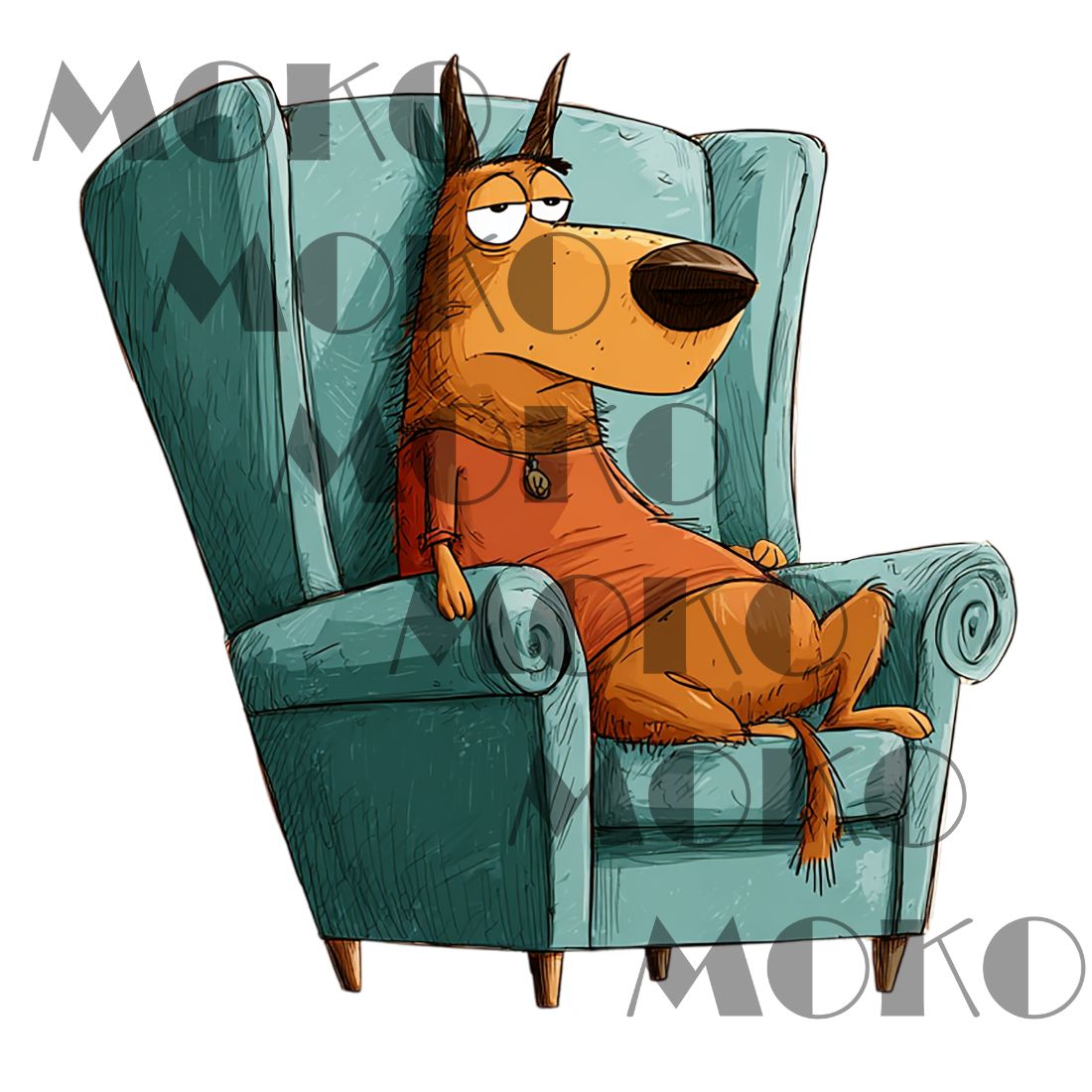 Hund Bügelbild, Lustiger Cartoon-Hund im Sessel in Aquarelloptik, Cooles Hundemotiv für Kinder T-Shirt, Hoodie und Stoffe
