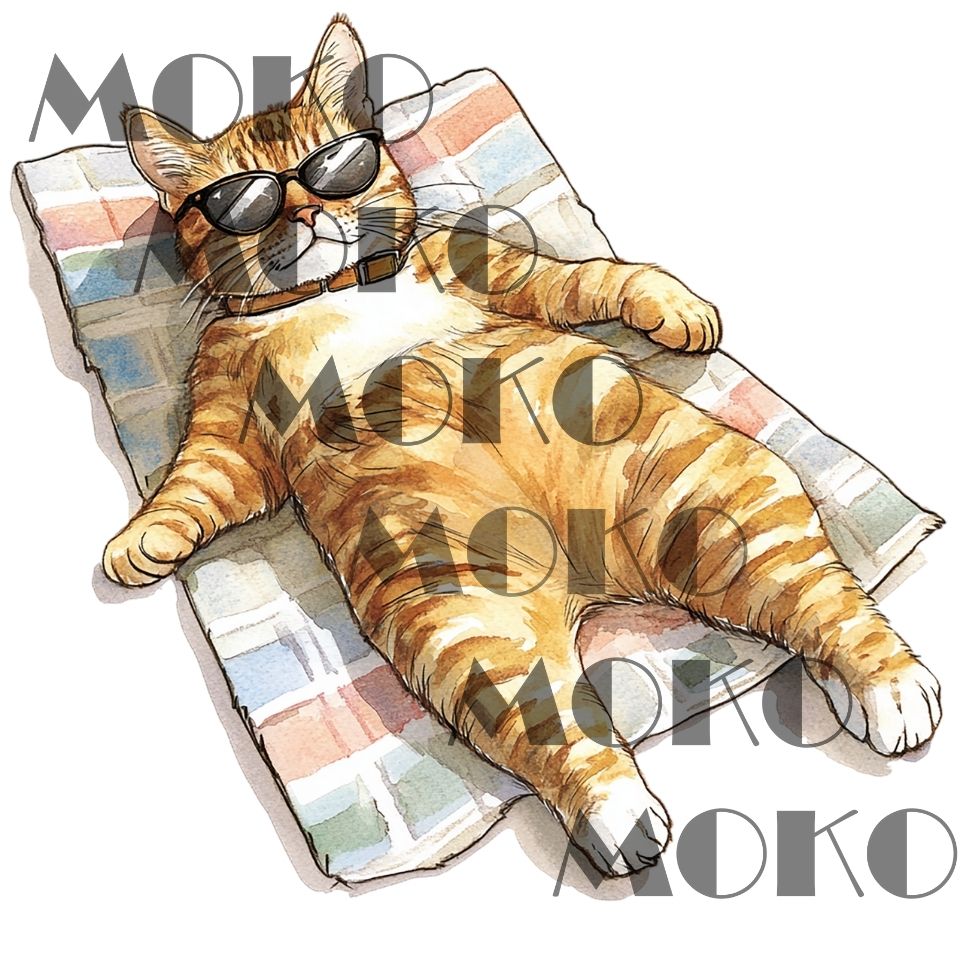 Katze Bügelbild, Lustiges Kätzchen mit Sonnenbrille am Strand Motiv in Wasserfarbe zum Aufbügeln, Sommerliches Tier Design für Kinder T-Shirt und Stoffe