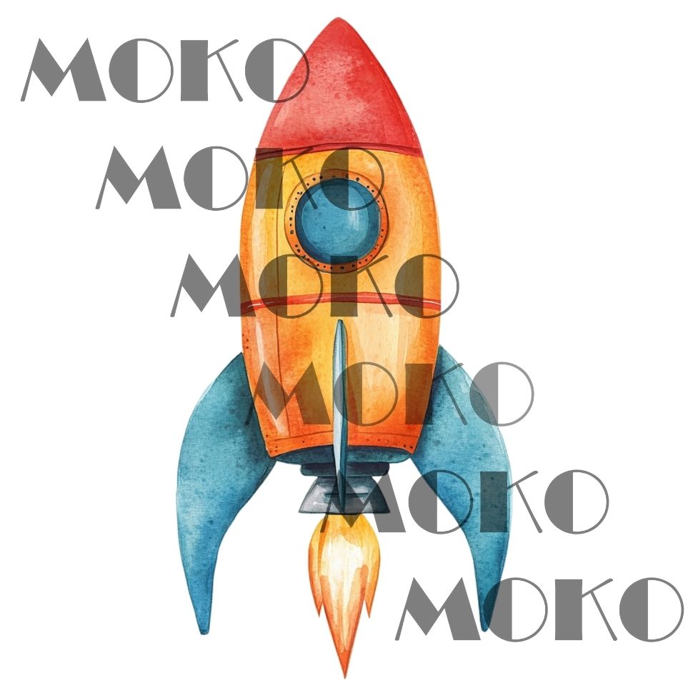 Raumschiff Bügelbild, Gelbes und Rotes Raumschiff Motiv in Wasserfarbe zum Aufbügeln, Rakete, Süßes Weltraum Design für Kinder T-Shirt und Stoffe